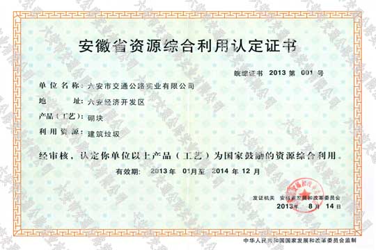 安徽省資源綜合利用認(rèn)定證書